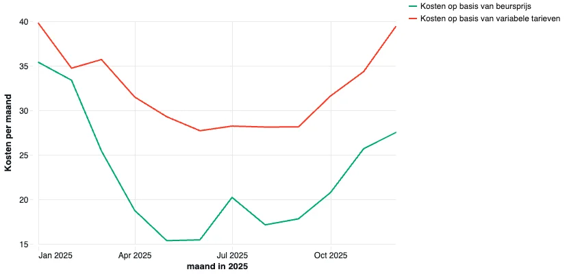 Uit een analyse van de Nederlandse elektriciteits- en gasmarkt in 2025 blijkt dat variabele energiecontracten voor consumenten een aanzienlijke kostenpremie met zich meedragen ten opzichte van een dynamische leveringsovereenkomst met beursprijzen. Voor zowel stroom als gas was het verschil in jaarlijkse kosten voor variabele contracten rond de +42%.