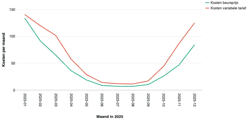 Maand | Kosten beursprijs (€) | Kosten variabel contract(€) | Verschil (€) | Premie (%) |