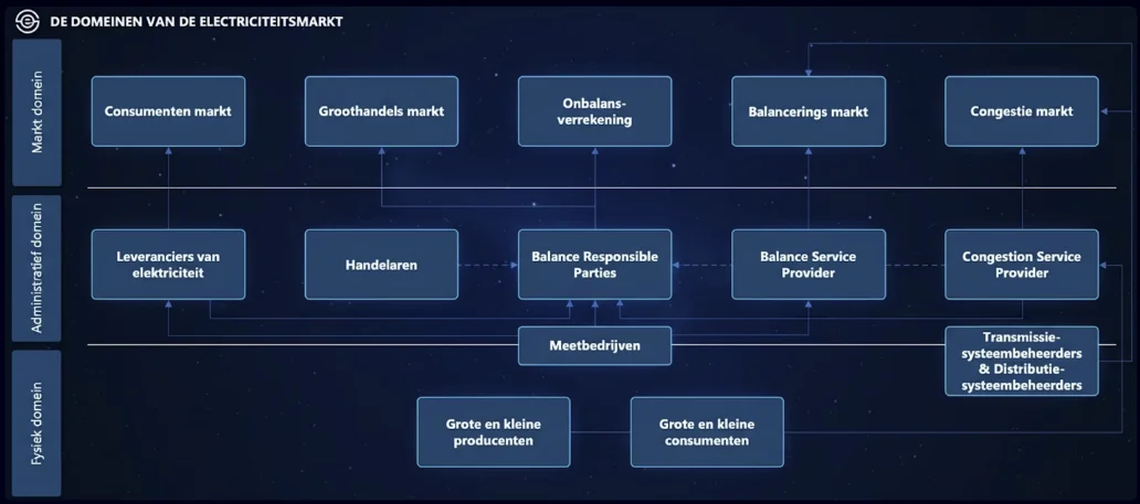 Simpel gezegd: De drie domeinen werken samen: in het fysieke domein stroomt de stroom, in het administratieve domein regelen partijen de handel, en in het marktdomein komen de prijzen tot stand.